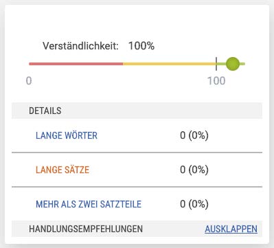 Sie können nun auf einzelne Aspekte der Analyse klicken (z.B.: Lange Sätze). Lange Sätze werden nun im Text markiert. Gleichzeitig erhalten Sie entsprechende Handlungsempfehlungen, sobald Sie auf die AUSKLAPPEN klicken.